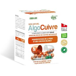 ALGOCUIVRE BT/30 COMP Marque : EDEN LIFE Complément alimentaire Riche en cuivre Pour cheveux blanc et peau dépigmentée Boîte de 30 comprimés