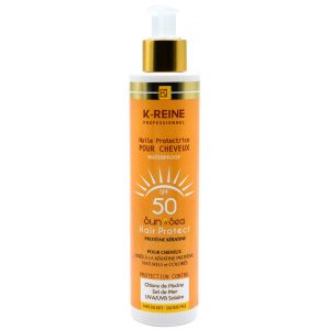 K-Reine Huile Protectrice Pour cheveux SPF50 Vitamine E et A, Protéines, kératine Pour cheveux lissés à la kératine Pour cheveux lissés à la protéine Pour cheveux naturels ou colorés Protège des rayons solaires UV Protège du chlore, du sel de mer Hydrate la fibre capillaire Waterproof, sans sulfate Contenance 200 ml