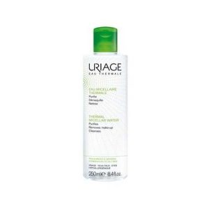 Eau micellaire démaquillante avec l’eau thermale d’Uriage pour le visage et les yeux qui purifie, démaquille et nettoie pour les peaux mixtes grasses.