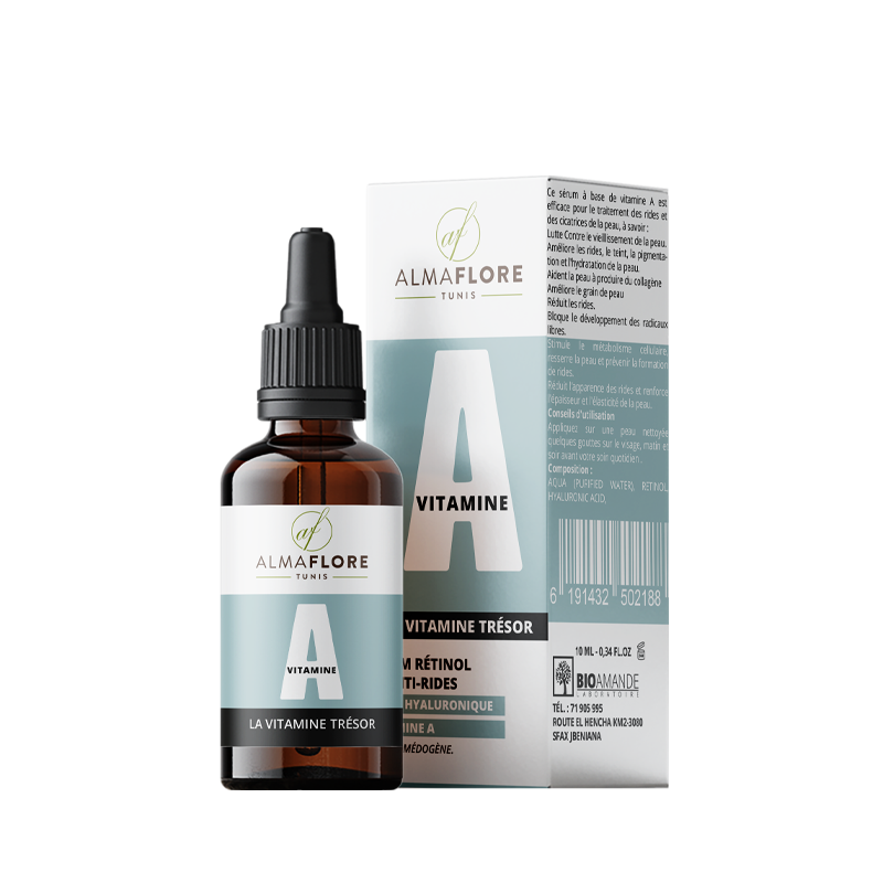 ALMAFLORE VITAMINE A est un produit de beauté qui a été développé pour combattre les problèmes de vieillissement de la peau, les rides et les cicatrices, grâce à l’action du « Rétinol », qui est un ingrédient essentiel de notre épiderme. La Vitamine A  joue un rôle fondamental dans la production de nouvelles cellules qui remplacent celles endommagées par les radicaux libres.