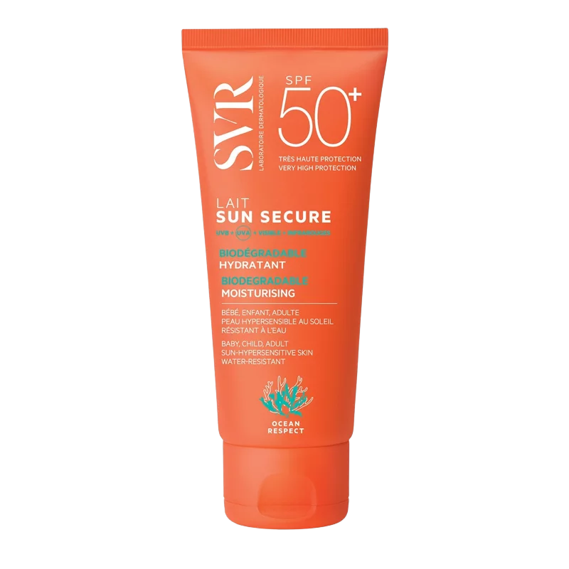 Lait hydratant invisible SPF50+SUN SECURE Lait offre une très haute protection SPF50+ au fini invisible pour le visage et le corps de toute la famille : bébé, enfant, adulte.