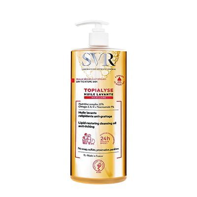 SVR Topialyse Huile Lavante relipidante destinée aux peaux sèches, très sèches à tendance atopique. Elle nourrit intensément la peau et préserve le film hydrolipidique tout en réduisant les sensations de tiraillements et de grattage. Sa formule onctueuse et riche nettoie en douceur tout en nourrissant intensément la peau. Grâce à sa haute concentration en actifs hydratants et relipidants, elle restaure la barrière cutanée et apaise les irritations.