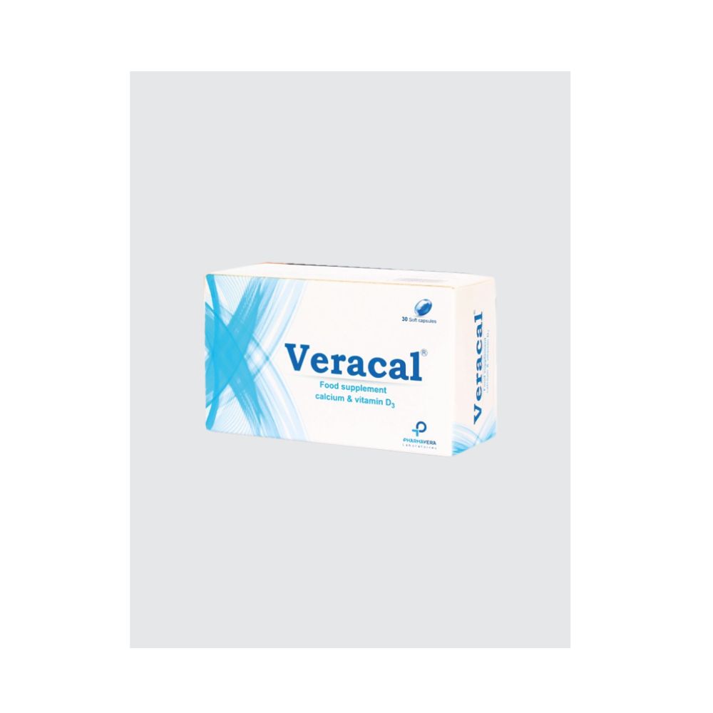 Complément Veracal : Vitamine D3 + Calcium Soutient la santé osseuse et la densité minérale Indiqué chez sujets âgés, femmes ménopausées, grossesse Traitement adjuvant de l’ostéoporose et corticothérapie 1 à 2 capsules/jour avec un verre d’eau Réservé aux adultes et enfants >6 ans
